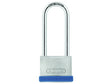 The ABUS Silver Rock™ 5 Padlock has a stable lock body made from zinc with a brushed stainless steel look. Fitted with a high-security, heavy zinc shackle and a blue plastic bumper for protection against scratching of protected surfaces. For increased protection there is a precision 5-pin cylinder with paracentric key profile and a Nano Protect™ bolt.