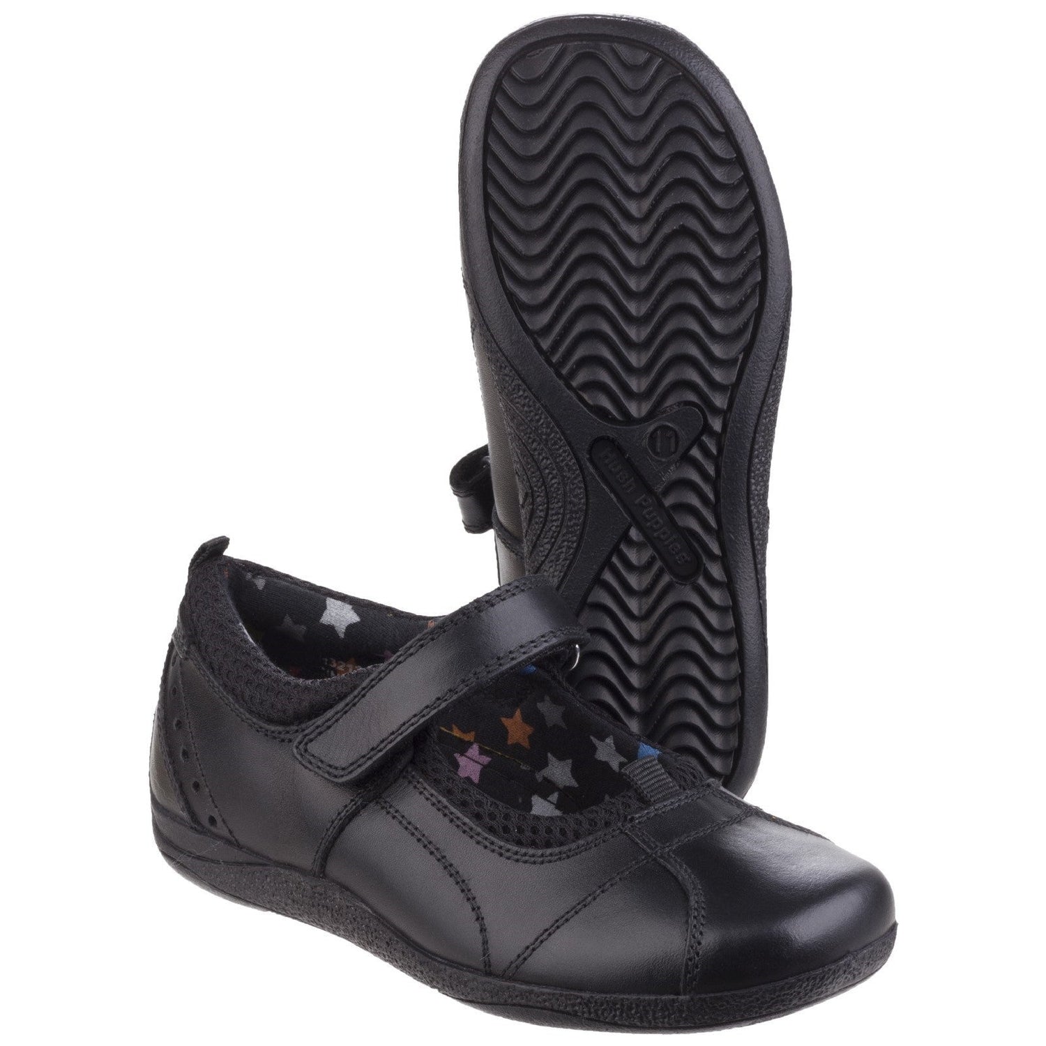 Hardwearing leather girl's school shoes with removable insoles and touch fastening for a customised fit. Padding around the heel and front of the shoe provides extra cushioned comfort. Our unique FIT LEFT FIT RIGHT system allows for 5 different width fittings for each individual foot, offering a comfortable and customised fit for growing feet. Hush Puppies' durable school shoes have a hardwearing rubber outsole and use robust leather to minimise scuff visibility.