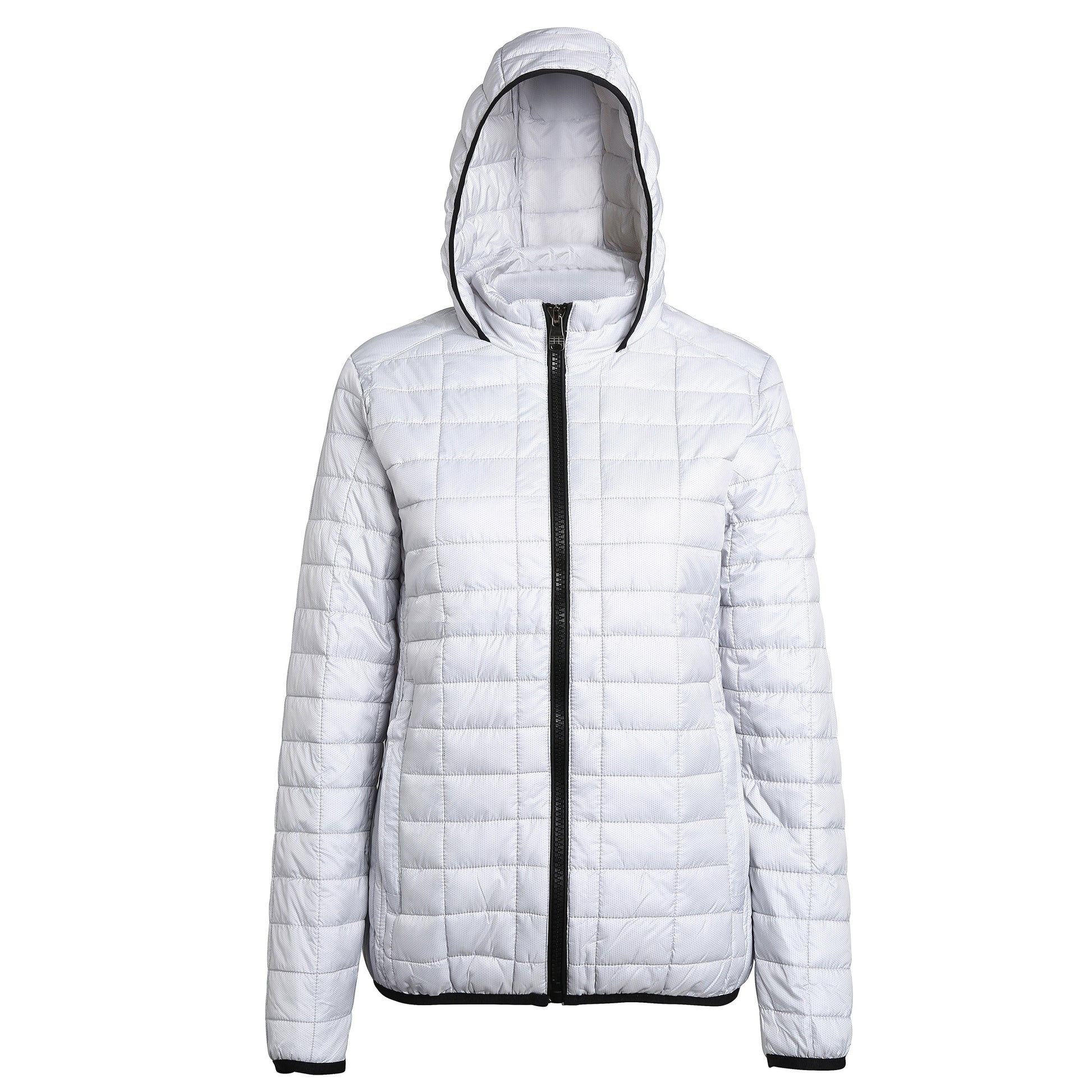 Fitted padded jacket. Honeycomb pattern with horizontal and vertical stitching. Piped edging. Zip fastening and two covered zip side pockets. Underside is lined with an open trim pocket useful for carrying mobile devices. Access point to inner jacket for easy embellishment. Elasticated cuffs and hem. High neck collar stand with attached hood. Product contains no branded neck label.* Removable Kimble or looped garment tags. Inner seam label holds important product information on one label with a second label containing brand information which can be cut-away.