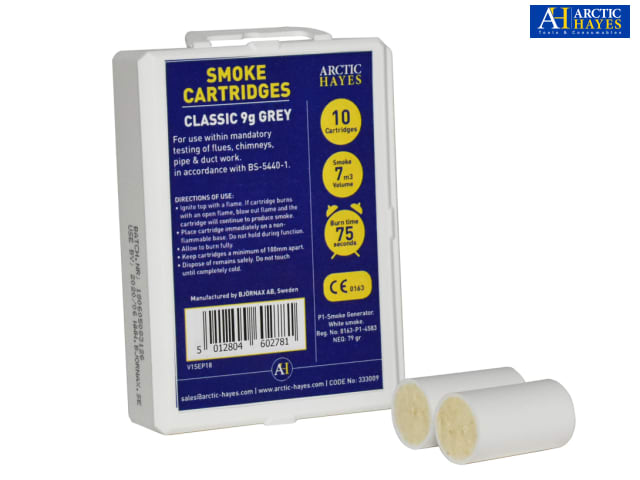 Arctic Hayes Classic 9g Smoke Cartridges are encapsulated in a polycarbonate plastic sheath. Perfect for testing air filters, fume hoods, air balancing and fans, as well as for use within mandatory testing of flues, chimneys, pipe and ductwork. White smoke can also be used for photography, special effects and more.