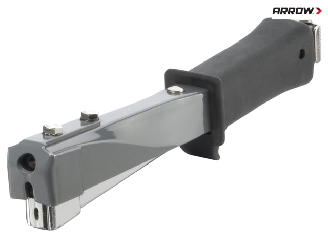 Professional hammer tacker with heavy-duty steel construction and anti-slip rubber grip handle. Removable handle pin releases magazine. Holds two full strips of Arrow T50® staples: 6, 8 and 10mm.