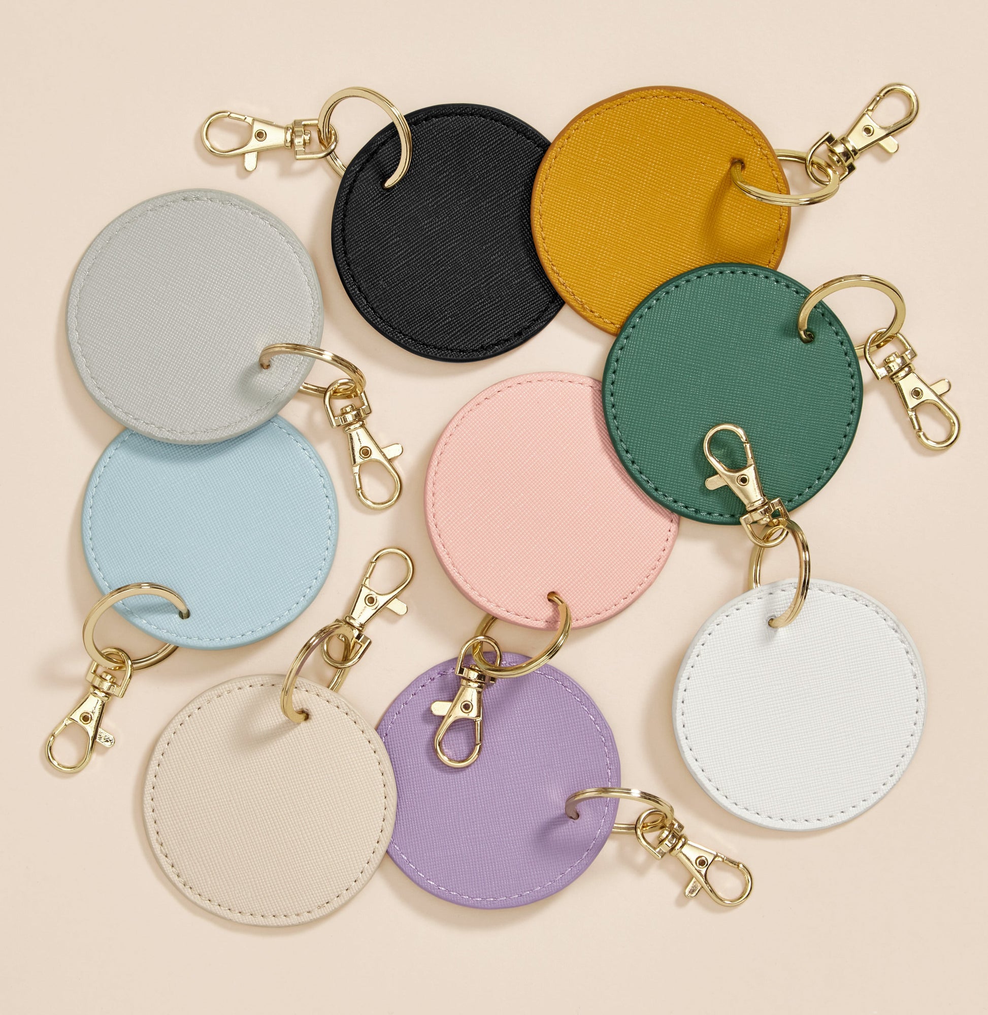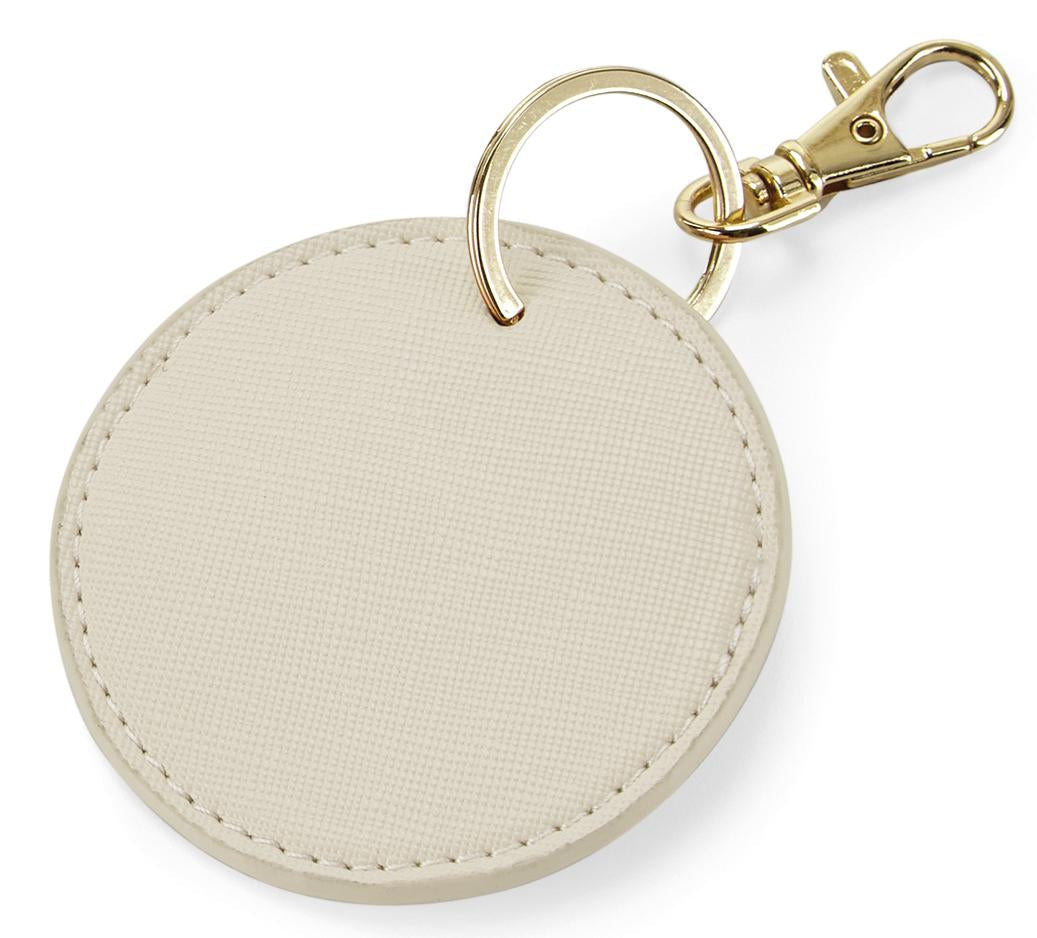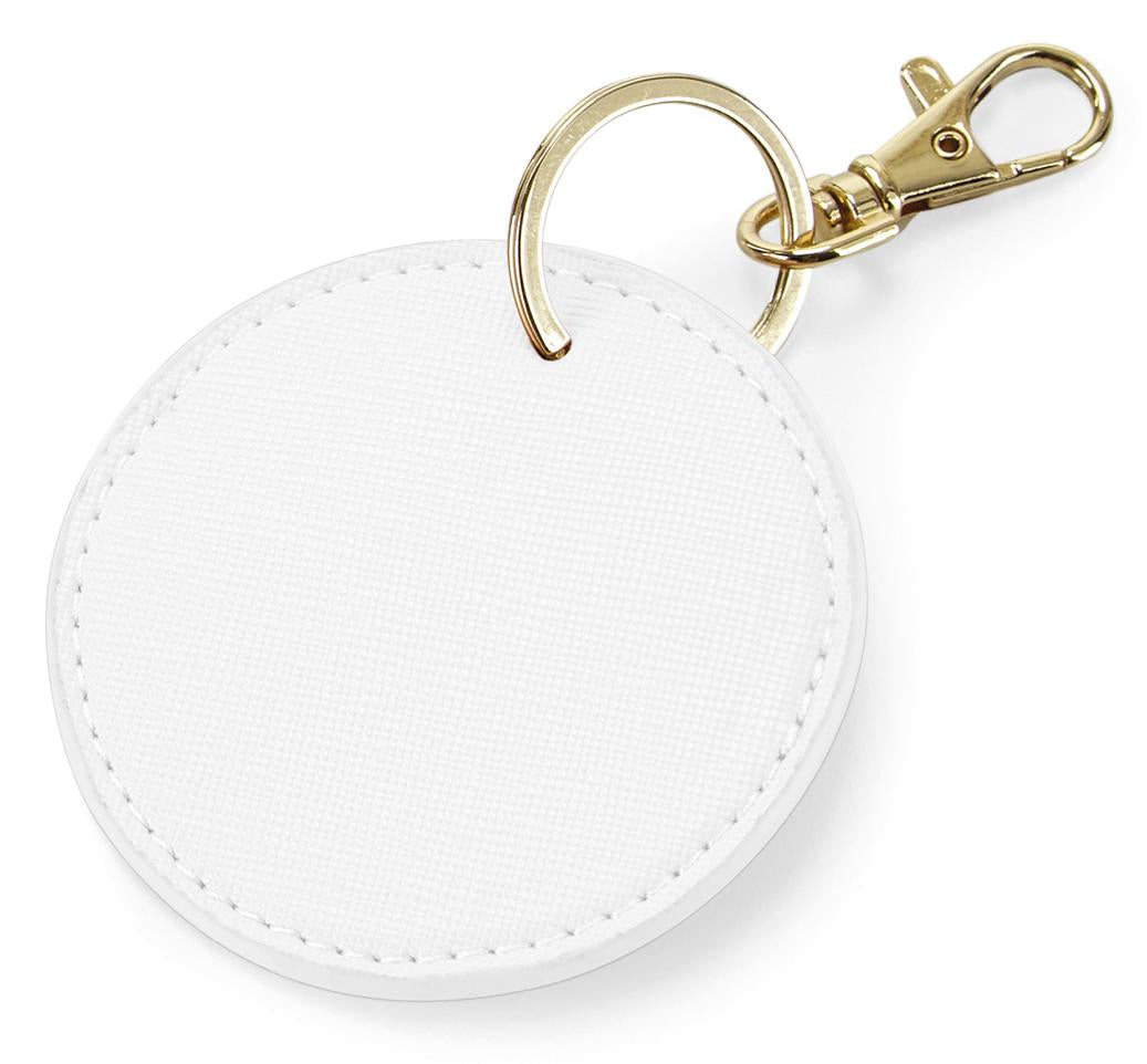 Personalise your Boutique collection with these interchangeable and customisable key clips. Designed for ease of decoration, this 100% leather-look design can be used as a keyring or bag charm. Fine grain Saffiano fabric gives a luxurious finish, while a high-shine, gold metal key clip adds to the premium quality. Also available in rectangular (BG744) and heart-shaped (BG746) styles.