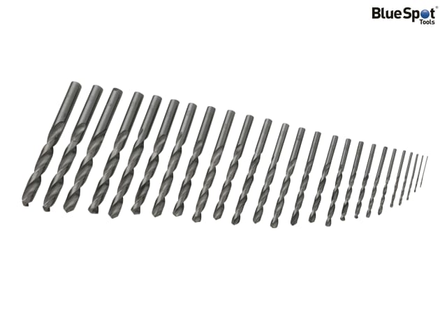 BlueSpot Tools HSS Drill Bit Set, manufactured from high-speed steel for increased durability. A ground flute gives increased accuracy when drilling. Suitable for drilling in iron, non-ferrous metals, plastic, steel and wood. Supplied in a robust metal case.