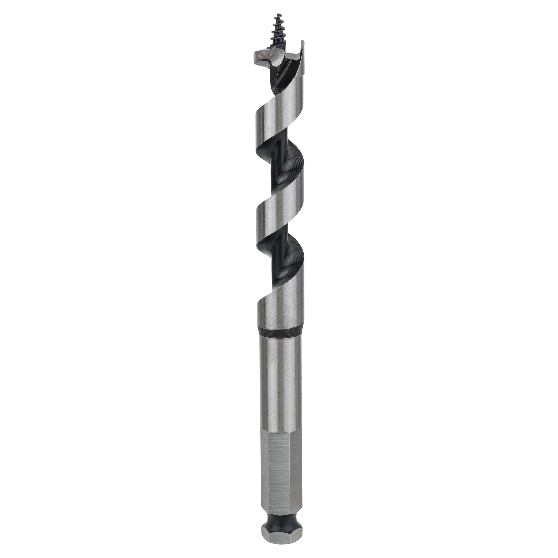 This drill bit has a hexagonal shank system and works with all drill drivers with a 13-mm chuck. The Auger Bit is ideal for fast drilling-accuracy when producing through-holes, pre-drilling for rafter nails and drilling deep dowel holes in wood. The heavy-duty self-feeding tip pulls the bit through completely, which allows for quick and effortless precision-drilling. Straight holes and a high chip removal rate and increased speed are made possible by the bit's optimised low-friction flute geometry with a solid centre. Its optimised scoring spur and precision-ground main cutting edge produce accurate holes. It is ideal for use in the ancillary building trades, for carpenters and roofers, and is suitable for soft and hard wood