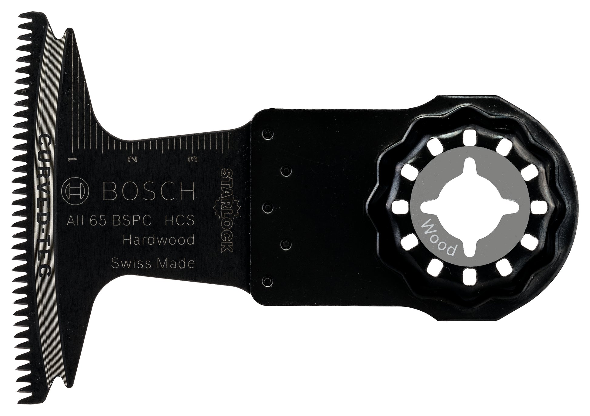 The Starlock AII 65 BSPC blade delivers wide and clean cuts in hardwood. Its 3-dimensional Japanese tooth configuration consists of sharp ground teeth ideal for cutting hardwood. This tooth arrangement minimises heat development for tear-free cuts with no ripping or burning. The blade's flat design reduces wobbling to enable a controlled cut due to direct power transfer. This product is intended for plunge cutting in hardwood or wooden boards and sawing in wooden panels. The blades rounded cutting edge (Curved-Tec) makes precise and smooth plunge cuts. The Starlock Snap-In mounting system allows fast blade removal and exchange within 3 seconds without having to touch the blade. The mounting system produces the highest power transfer thanks to a 3-dimensional tight-fitting connection between machine and accessory. Use this product with all Starlock, Starlock Plus and Starlock Max power tools as well as common multi-tools.