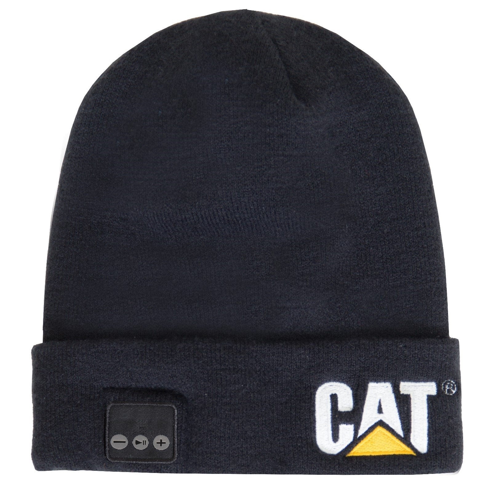Knitted beanie hat with embroidered Caterpillar twill patch on front featuring a built in microphone.