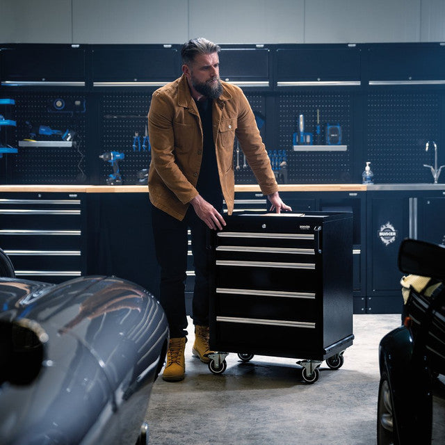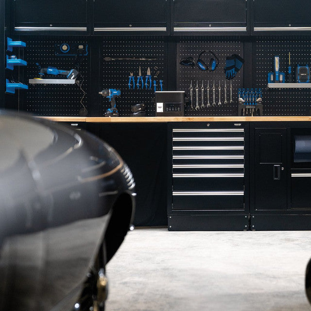 Part of the BUNKER® modular storage system. This stunningly designed combo is easily installed inside a garage or workshop to create your ideal storage system. All units are made from premium-quality steel and have a durable matt black textured industrial powder-coated finish. The floor cabinets provide incredibly versatile storage, featuring large cupboard spaces with fully adjustable shelves and smooth soft-close drawers lined with lush foam to protect your tools. They also offer a functional workspace with hardwood worktops, a built-in stainless steel sink (tap not included), an integrated rubbish bin and paper towel roll holder, plus a mobile cabinet with five drawers. The fixed base cabinets have adjustable feet for optimal positioning on an uneven floor. All wall cabinets have lift-up doors for convenient access, operated by whisper-quiet gas struts. For added storage, the back panels act as pegboards, and each includes one pre-cut hole for access to a power supply. Each unit has an integral lock for security and two keys are supplied. The combo comes with all the required fittings for simple installation. For your quality assurance, all BUNKER® units include a 10-year warranty. Every combo includes a free magnet of the distinctive BUNKER® logo.