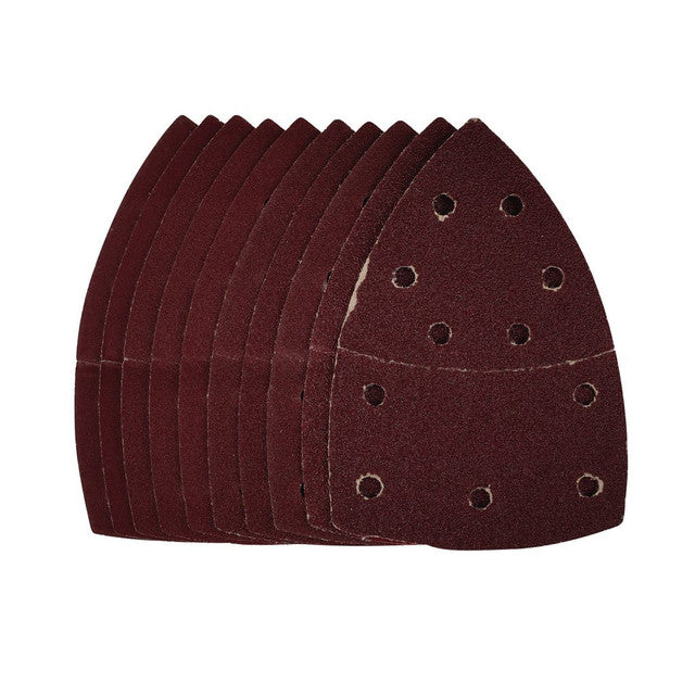 This pack of 10 multi-sanding sheets of assorted grit have a perforated tear off delta sheet for detail sanding (102 x 62mm, 93mm). They are made from aluminium oxide that is resin bonded to provide improved grain adhesion, anti-static qualities and long-lasting performance. The heavy duty E-Weight backing paper makes the sanding sheet more durable - able to withstand the toughest jobs. The hook and loop backing offers decent adhesion to facilitate the fast changing of sanding sheets. The 11 pre-punched 8mm holes help eliminate clogging and improve the dust extraction. Ideal for sanding and finishing wood, metal, aluminium alloy, painted surfaces, plastic and fillers. Compatible with most multi sanders with 102 x 62mm, 93mm hook and loop backing pads including Stock No. 57681.