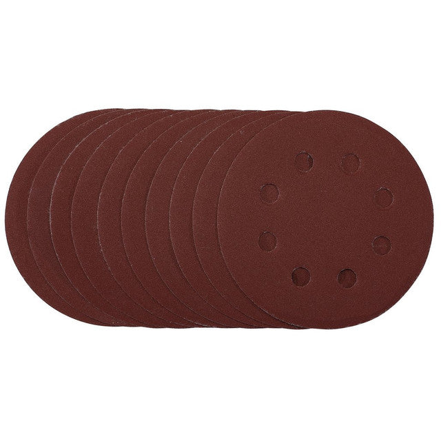 This pack of 10 premium quality aluminium oxide 115mm (240 grit) sanding discs are resin bonded to provide improved grain adhesion, anti-static qualities and long-lasting high performance. The heavy duty E-Weight backing paper makes the sanding disc more durable – able to withstand the toughest jobs. The hook and loop backing offers decent adhesion to facilitate the fast changing of sanding discs. The eight pre-punched 8mm holes improve the dust extraction during sanding. Ideal for sanding and finishing wood, metal, aluminium alloy, painted surfaces, plastic and fillers. Compatible with all 115mm hook and loop backing pads.