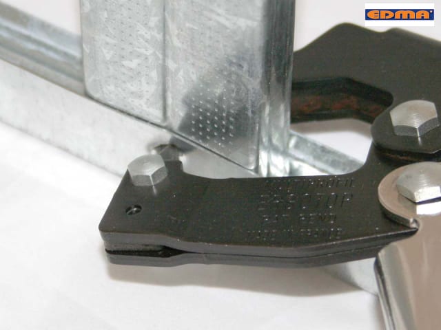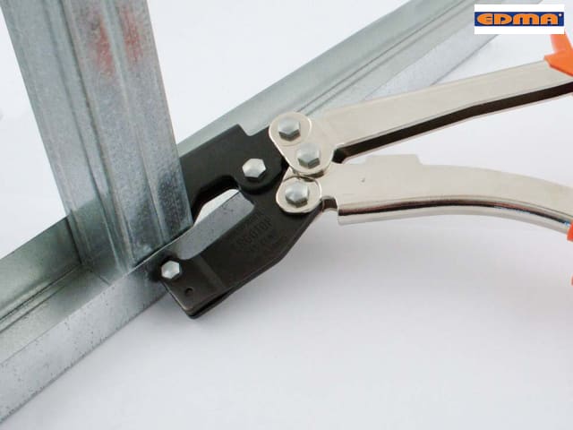 Ergotop Multiprofil Metal Frame Pliers for use in drywall installation. With a special application for right and left setting. Punch process. Universal stud crimping tool, able to work on both sides of the stud. No screws or anchors needed. Ergonomic design, special soft-grip handles. Replaceable punch.