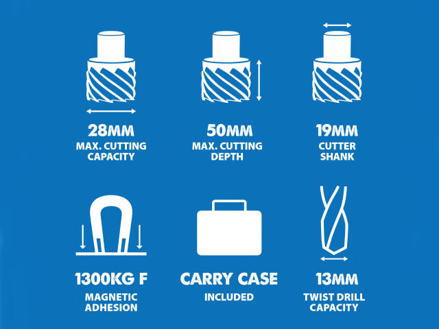 Versatile, accurate and fast, the EVOMAG28 combines strong electro-magnetic adhesion at 1300kg. The spoke handles can also be mounted on the right or left side of the machine for better ease of use. The cuts are precise and clean due to an optimised rotation speed of 570rpm. It offers incredible value and an impressive 13mm twist drill capacity with the added capability to use up to a 28mm cutter.