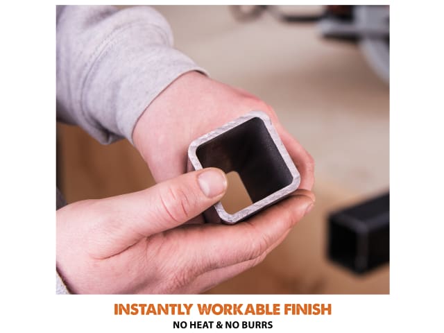 When cutting mild steel the saw produces a square, ready-to-weld cut with no heat, no burrs and virtually no sparks, far superior to abrasive cutting methods. The saw features an adjustable cutting depth and 0-45 ? bevel capabilities for versatile cutting in any material. It also features channelled air flow and a vacuum extraction port, that helps to keep the cutting line visible. The electric blade brake and blade guard, (that closes in 0.4 seconds) improves user safety and reduces exposure to a spinning saw blade. The integrated LED light improves visibility of the work piece.