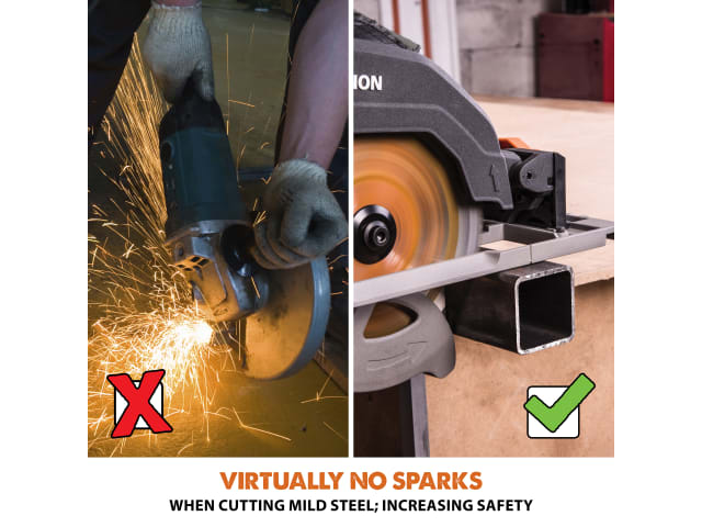 The Evolution R185CCSX Circular Track Saw is perfect for trade or DIY users thanks to its powerful motor and optimised gearbox. When combined with the Evolution R185TCT-16CS blade (supplied) it can cut a variety of materials such as mild steel, aluminium, wood (even with embedded nails), plastic, copper, PVC and more. When cutting mild steel the saw produces a square, ready-to-weld cut with no heat, no burrs and virtually no sparks, far superior to abrasive cutting methods.