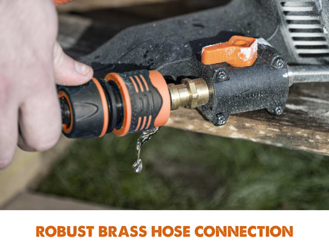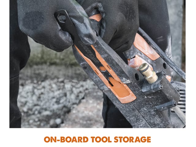 Evolution Power Protect technology protects internal parts from dust and water ingress, making it fit for use in the most demanding environments. Ideal for cutting concrete, reinforced concrete, stone, brick, paving and more. The built-in dust suppression features dual-sided water delivery, armoured hose routing and robust brass hose connection, making it compliant with dust management regulations. Its wheeled skid plate takes the strain out of long, ground-level cutting and also allows you to put the saw down while the blade is still spinning.