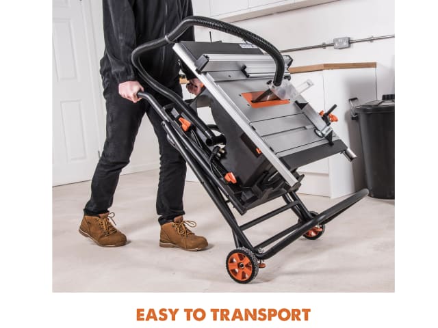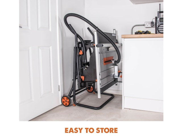 With a fully adjustable blade, with a rise and fall (0-80mm) and the tilt capacity (45° to the left hand), for great cutting versatility and a sliding carriage system is available to the left-hand side. The mitre gauge with an adjustable face-plate incorporates quick-access positive angle stops from -60? to +60?. Multi-Function, versatile table-top with integral quick-deploy table extensions to the right and left-hand sides.