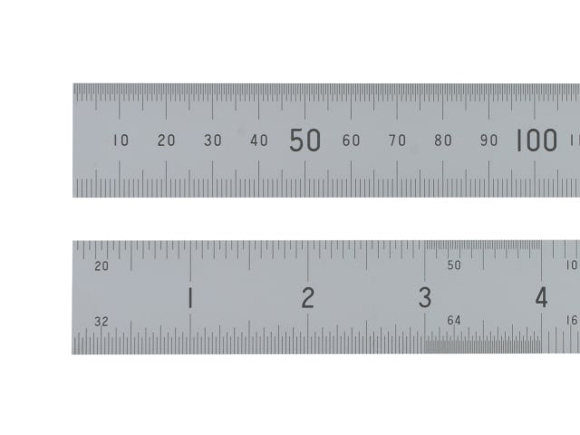 Fisher steel rule with satin chrome finish and photo etched markings, subdivided in mm, and 10th, 16th, 20th, 32nd, 64th.