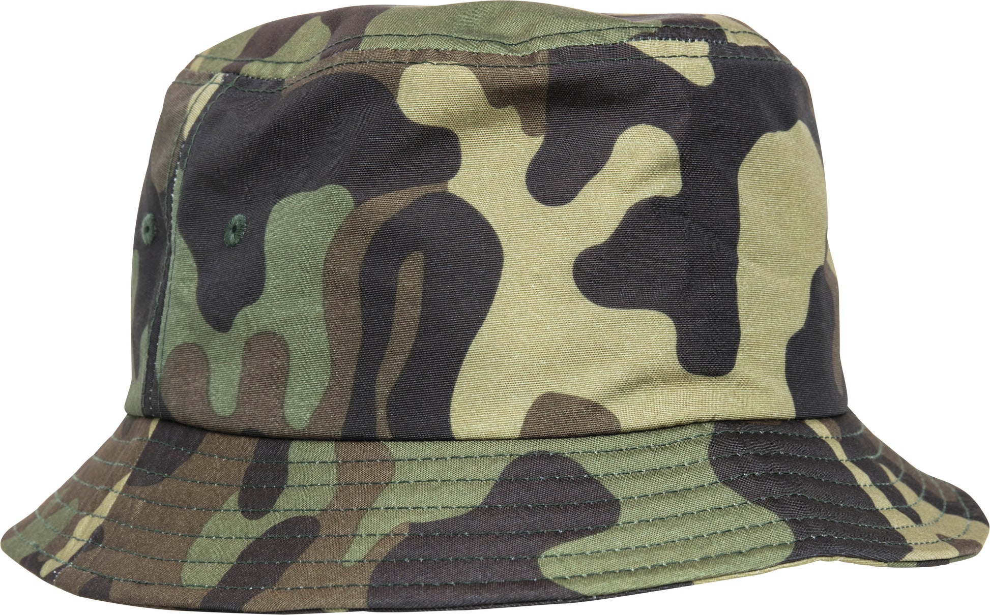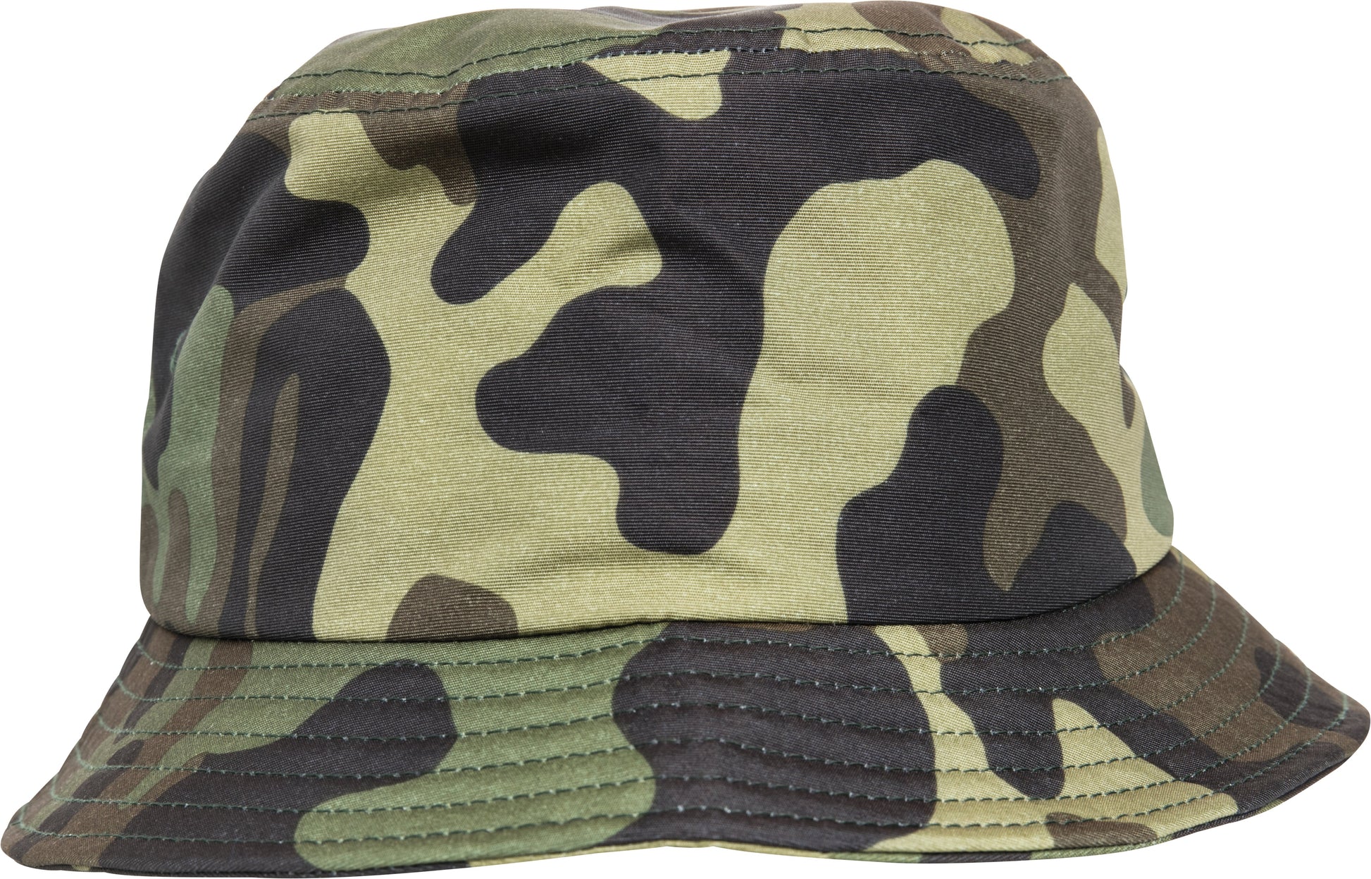 Camo bucket hat. Green camouflage pattern. Circumferential brim. Decorative stitching. BSCI certified. WRAP certified.