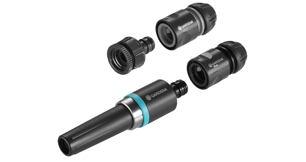 The GARDENA EcoLine Basic Set is the ideal combination of sustainability and functionality for your garden. The starter set with cleaning nozzle, tap connector, adapter, hose connector and water stop ensures a secure garden hose connection to the tap. More than 90 percent of the plastic used in the set was made from recycled material, mainly from household waste. The set not only looks classy, but also ensures a long service life thanks to its high-quality manufacturing. In addition to the recycled plastic, 35-percent-recycled stainless steel was used for the metal components. The discreet but elegant design concept gives the basic equipment a look that is as stylish as it is timeless and perfectly suits your garden or your terrace. The 2-in-1 spray jet on the nozzle offers the optimal water jet for different situations - whether the spray jet for cleaning work or the softer spray jet for watering, the water spray is smoothly adjustable. The water stop in the set allows you to change the attachment, for example from a sprayer to spray lance or sprinkler, without going to the water tap - the water stops automatically when the sprayer is removed and starts again as soon as the new attachment is plugged in. The GARDENA EcoLine Set is compatible with 1/2" - 5/8" (13-15 mm) hoses, as well as suitable for water taps with 21 mm (G 1/2") und 26,5 mm (G 3/4") threads. The tap connector features the clever Anti-Splash function, providing a focused water flow to fill up watering cans or buckets without a hose, all splash-free. The EcoLine basic set is UV and frost resistant and can therefore be left outside all year round. It is Made in Germany and is backed by a five-year manufacturer's warranty from GARDENA. A natural choice for passionate gardeners. ReTh!nk - The new EcoLine range. Sustainably made. aesthetically designed. Durably built.