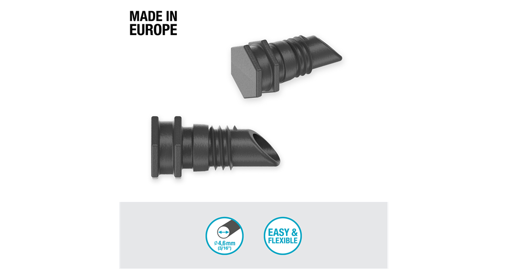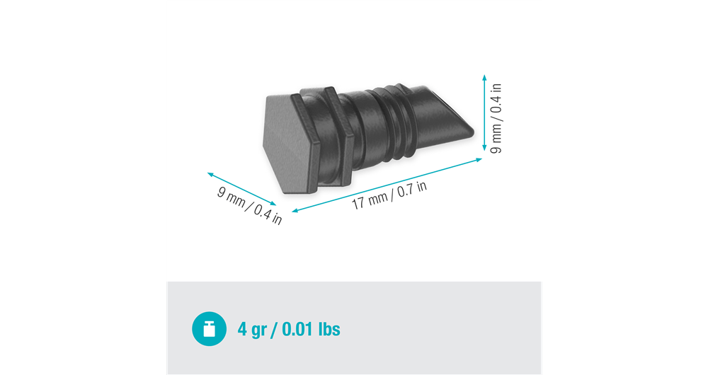 The Plug 4.6 mm (3/16") from GARDENA is ideal for securely sealing the end of your 4.6 mm Supply Pipe and Drip Irrigation Line in the Micro-Drip-System. Optionally, you can also reseal an opening in the 13 mm Connecting Pipe with the Plug if you have previously pierced an opening with the Assembly Tool. Installation is convenient and simple thanks to the clever connection technology. For a reliably water-proof Micro-Drip-System and constant water pressure, combine with the separately available Master Unit 1000 (Art. No. 13333-20) or Master Unit 2000 (Art. No. 13310-20). The reusability of the MDS-components is a great advantage of the system and promotes sustainability. Simply connect the MDS-components together thanks to the Easy & Flexible connection technology, expand them flexibly and detach them easily. The quality product Plug 4.6 mm (3/16") by GARDENA is made in Europe. Micro-Drip-System. Caring for your plants and every precious drop. Easy, accurate, water and time-saving irrigation.