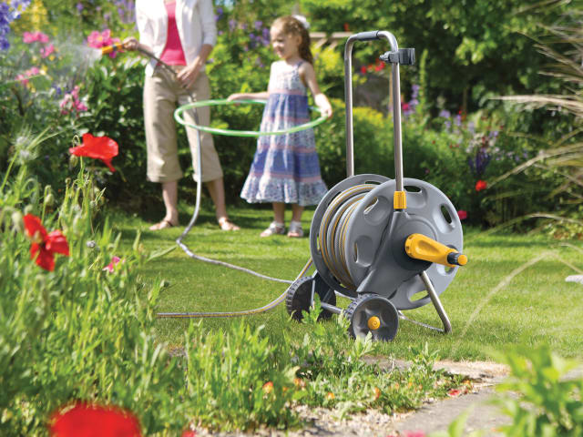 The Hozelock Assembled Reel has a small internal drum diameter and an extra-long winding handle, rewinding is easy. This hose reel has a robust metal towing handle, oversized soft patterned wheels and steel axle, which makes moving the hose reel easy.