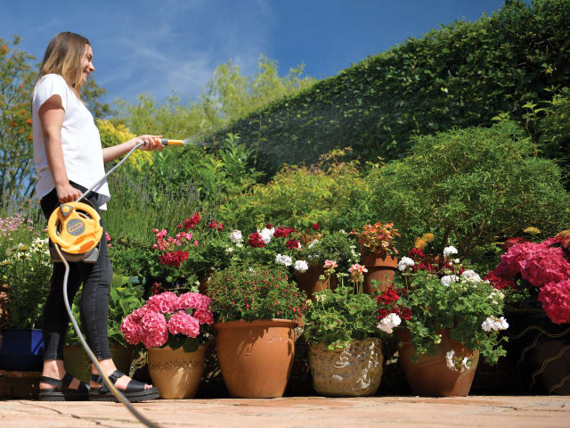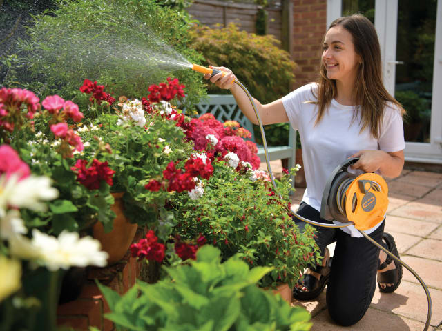 The Hozelock Micro Hose Reel has a rotating drum with a handle for quick and tidy hose storage without tangles. Its Click & Go connector clicks onto the tap, the handle allows easy winding/unwinding of the hose as you walk, and the nozzle clips onto the front of the reel. Water at any length, no need to fully unwind. Perfect size for small gardens: keep it near the tap, or store away neatly.