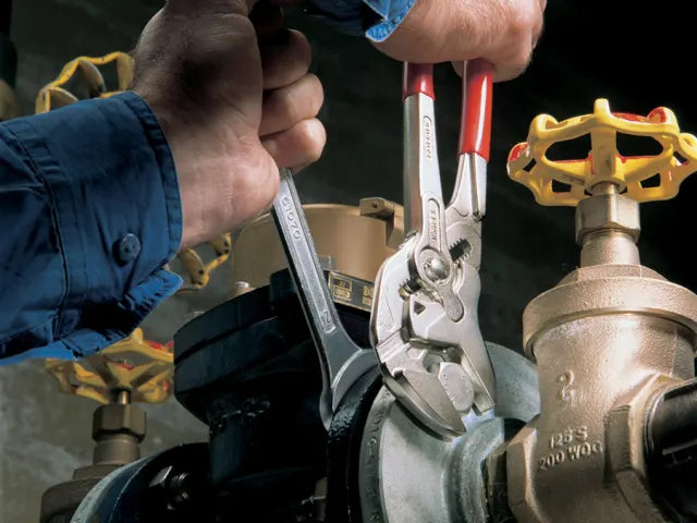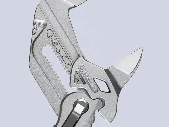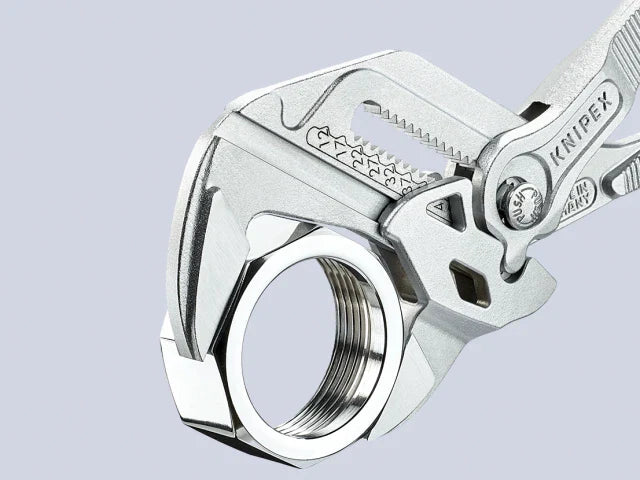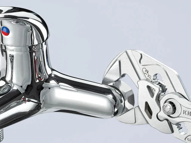 The Knipex 86 03 Series Pliers Wrench with dipped PVC handles and smooth parallel jaws for cautious installation of plated fittings or sensitive surfaces. More effective, faster and greater capacity than an adjustable spanner of the same size.