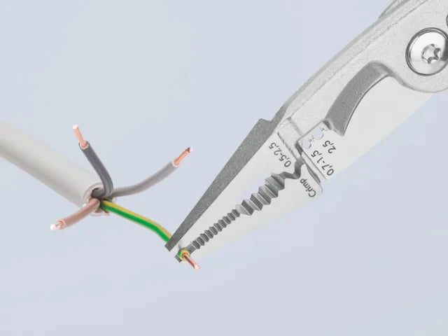 -Smooth surfaces near the tips grip single cores without damaging them; serrated gripping surfaces and pipe grip for gripping flat and round material.