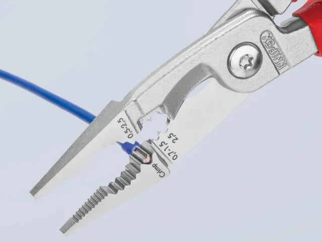 These KNIPEX 13 Series VDE Multifunctional Installation Pliers are fitted with multi-component grips, VDE tested up to 10,000V and safe for work up to 1,000V. They conform to DIN EN / IEC 60900. The head is made from forged, vanadium electric steel, multi stage oil-hardened.