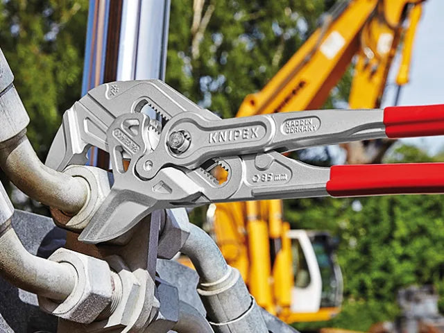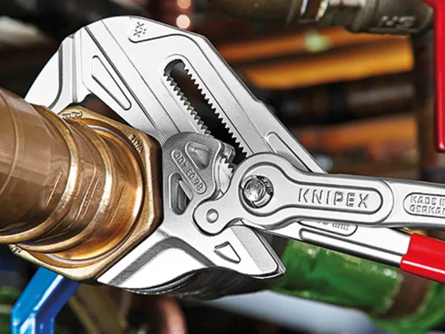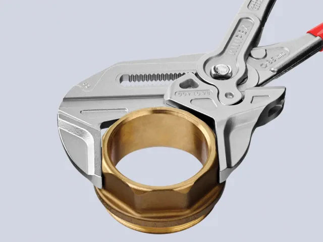The Knipex Pliers Wrench XL acts as pliers and a wrench in a single tool. This unique installation tool is suitable for opening widths up to 85mm (3.3/8in). It acts as an adjustable tightening tool and is ideal for large screw joints, with pressure-sensitive surfaces such as plastic, copper, brass, stainless steel and chrome.