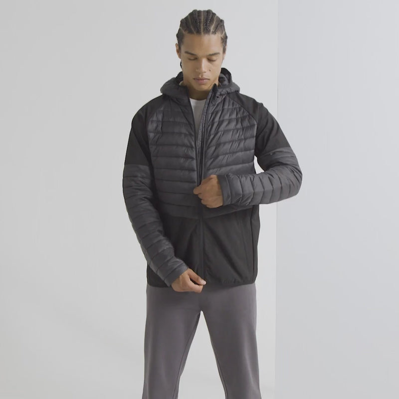 Hybrid jacket with diagonal quilted upper chest and full back. Lower jacket is shell fabric. Full zip-through style with panelled hood. Hood is elasticated for a snug fit. Front pockets. Elasticated hem. Quilted detailing to arms with lower arm in shell fabric. Internal storm flap with zip guard. WRAP certified. SEDEX certified. BSCI certified. We recommend using block out vinyl and inks.Product contains no branded neck or waist label.* Removable Kimble or looped garment tags. Inner seam label holds important product information on one label with a second label containing brand information which can be cut-away.