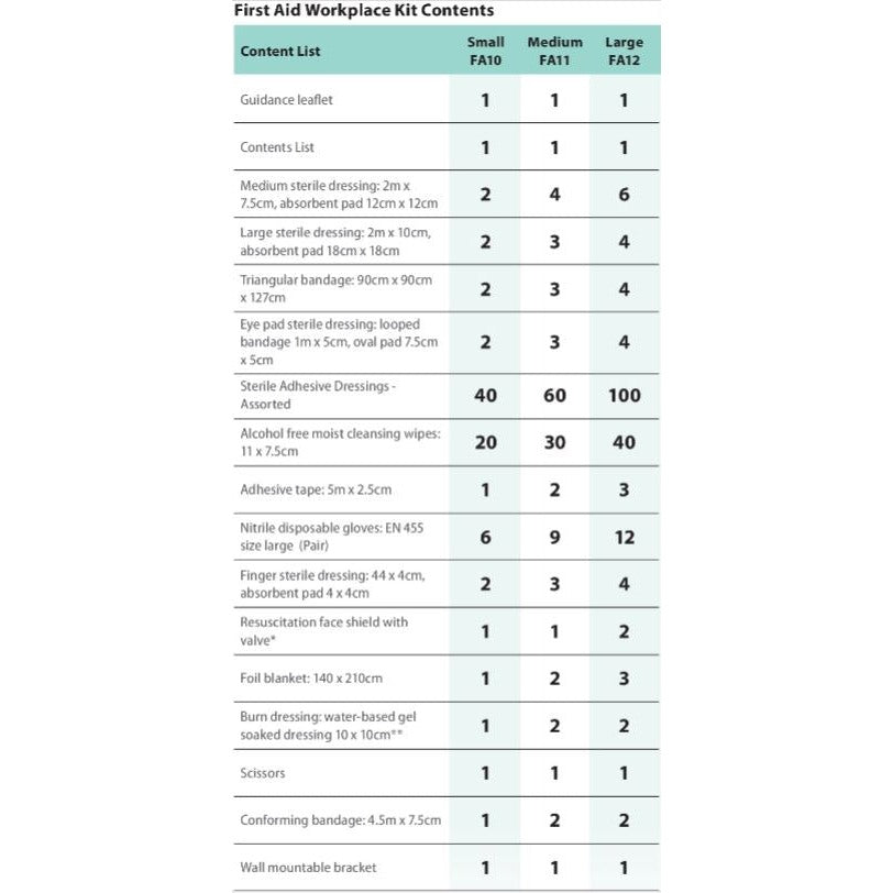 This kit is ideal for workplace environments with a larger number of employees. The contents are up to date in accordance with the latest standard and allow employers to demonstrate and comply with safety and legal obligations.