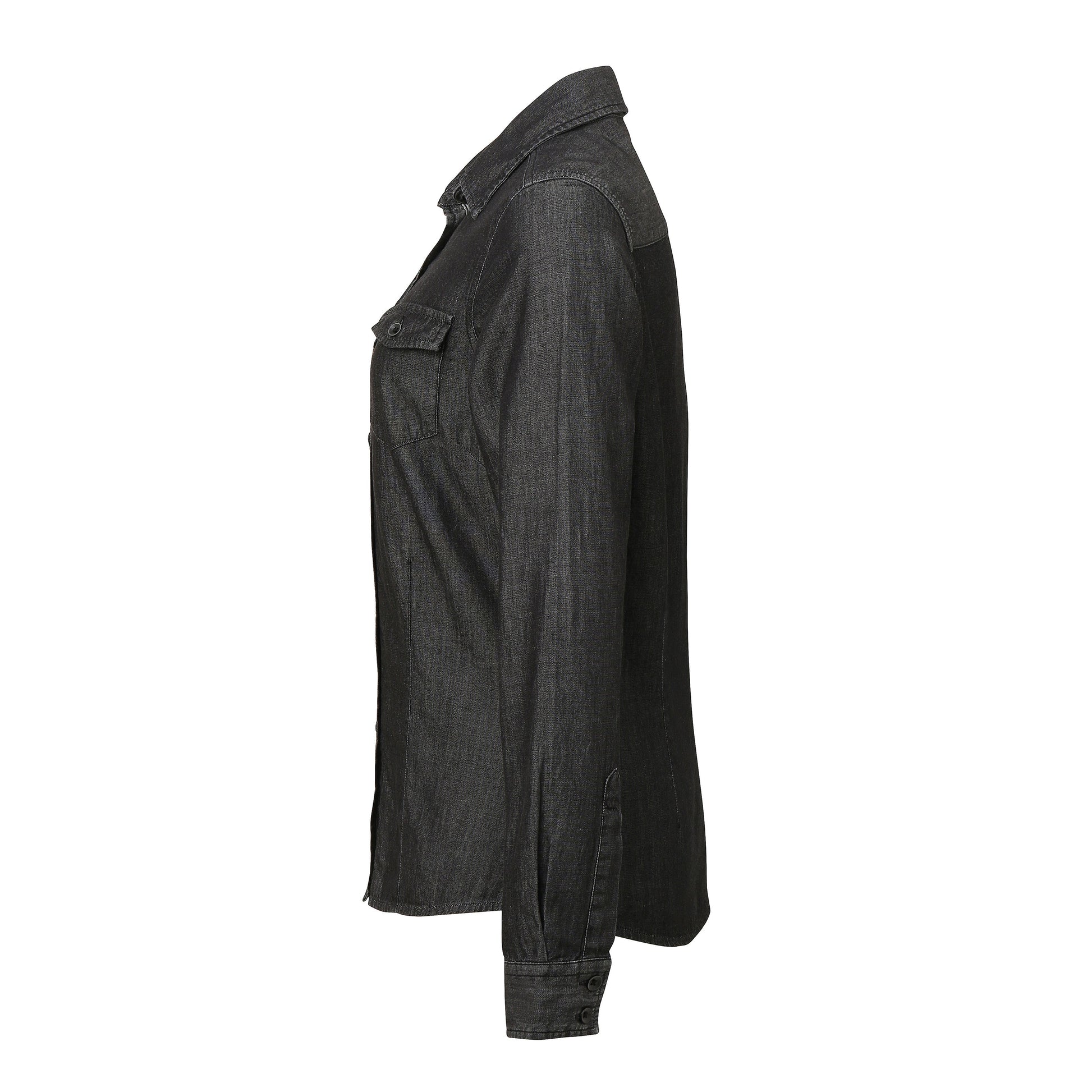 Long sleeve denim shirt with contrast stitch detail with two chest pockets. Buttoned cuff and sleeve guard. Curved hem. Back yoke. WRAP certified. BSCI certified. Reach certified. SEDEX certified.