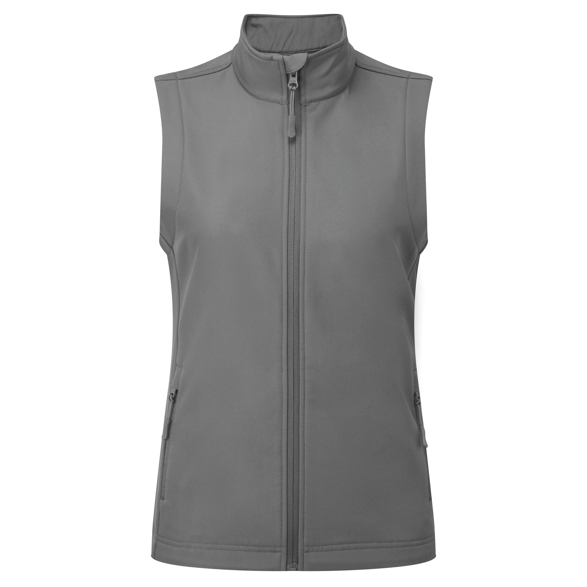 Two-layer softshell gilet with a bonded fleece inner, featuring two handy patch pockets. Full zip-through style with zip pull. Cadet collar with chin guard. Zipped side pockets with zip pulls. Curved hemline with an elastic drawcord and plastic cord lock to secure in place. Stitched side panels enhance this more feminine fit. Made from 100% recycled polyester with Premiers Windchecker® trademark for a wind- and water-resistant style that is suitable for screen print applications. Global Recycled Standard certified.