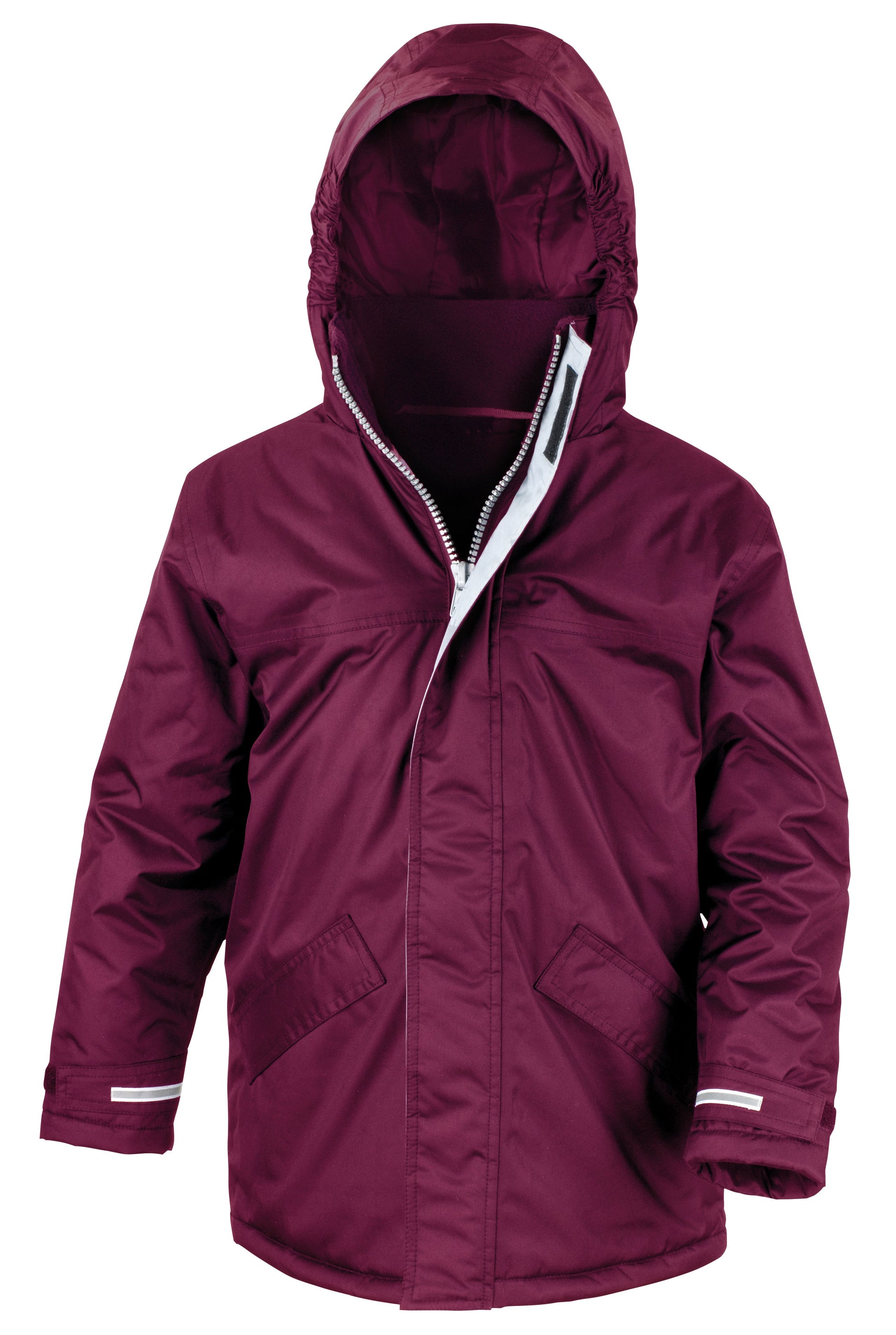 Waterproof-StormDri 2000. Windproof. Fully taped waterproof seams. Long fit. Super warm. Concealed 3-panel hood in collar. Full front heavy duty zip. 2 concealed front pockets with storm cover. Super warm fleece-lined collar. Reflective cuff. Fleece-lined front pockets. Adjustable drawcord hem. Ready to brand cut away label. Oeko-Tex certified.Decorating methods: Embroidery, Direct print, Transfer print. Decorators access point: Full hem and left chest