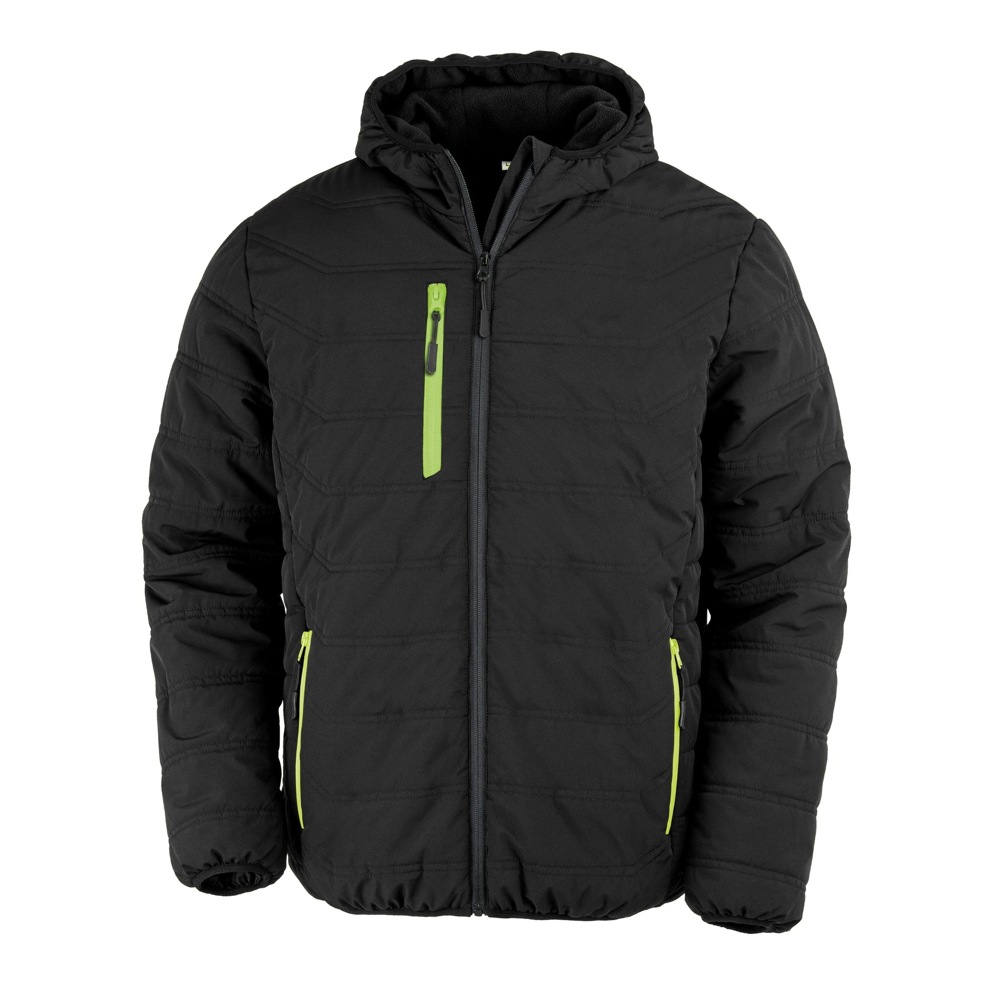 Showerproof. Breathable. Windproof. TPU membrane provides added weather protection. Recycled equivalent x 27 1 litre bottles using recycled padding, fleece and polyester. Heavy padded body with fleece lining. YKK front zip. Three contrast colour zip pocket. Inner storm flap. Fleece-lined hood. Soft bound cuff. Black zip pulls, inside pocket. Hang loop. Integral padded hood. End of life recyclable. Biodegradable bags. Oeko-Tex certified.
