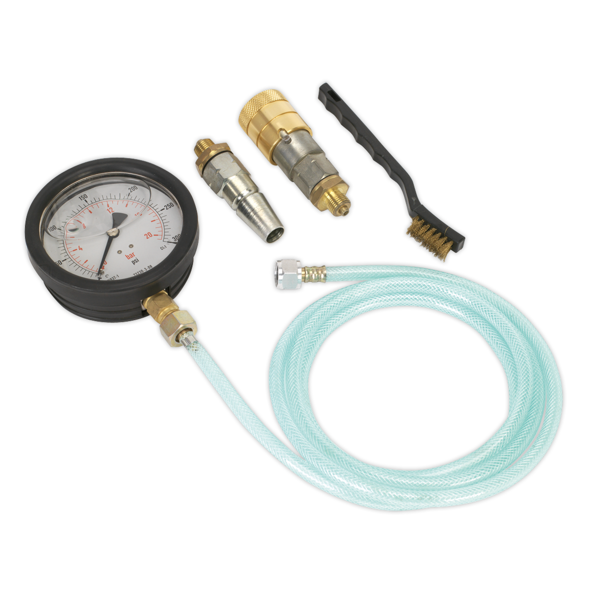Locate problems relating to commercial vehicle air brake pressure quickly and easily. Three gauges provide more accurate diagnosis when testing and locating faults along the braking system. Suitable for use at the roadside or in the workshop. Features three large 0-20bar(0-300psi) gauges with rubber bumper. Includes male/female couplings, three hoses and a wire brush. Supplied in storage case. • Locate problems relating to commercial vehicle air brake pressure quickly and easily.