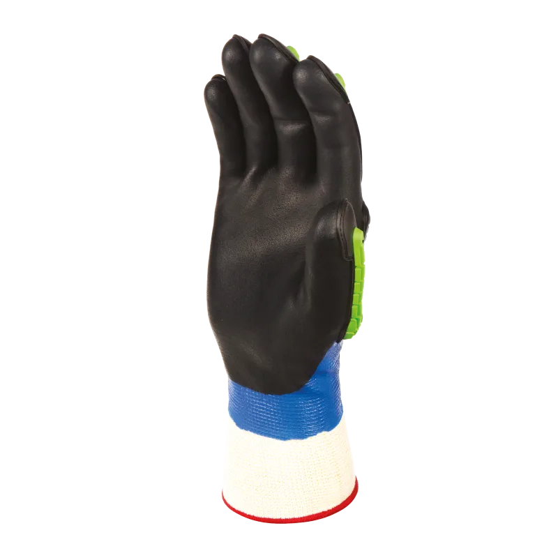 Fully coated nitrile with an additional coating of foam nitrile to the palm. The SHOWA-configured Thermo Plastic Rubber (TPR) protection shields to the back of the fingers & hand are designed to bolster protection against crushes & light impacts.